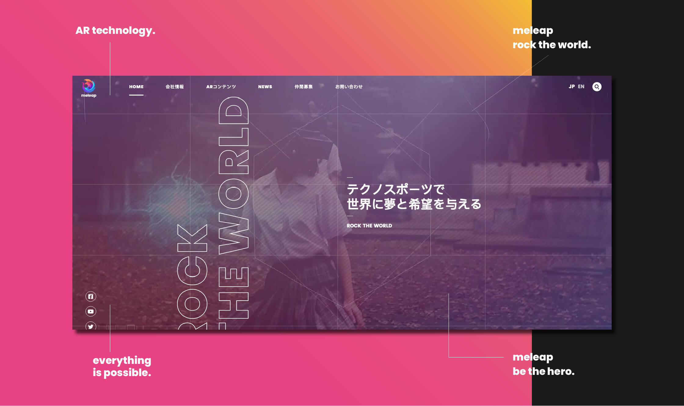meleap 是一家總部設於東京的新創遊戲開發公司,主要產品是打造AR結合運動項目,目前其王牌商品HADO已經全球23個國家出售授權使用。這次委託良艮創意打造全新的官方網站,主要目標是在於呈現公司在內容創造的實力,以及遊戲本身的活力與趣味感,將其之前無法適應各種瀏覽環境的介面改善。再加上搭配全新公司品牌識別,使用了極為搶眼的漸層顏色傳達公司本身的活力調性,也協助新網站視覺拍攝設定,達到快速呈現各種公司所提供的遊戲內容與架構。體現出meleap本身讓使用者可以享受遊戲的創業精神。