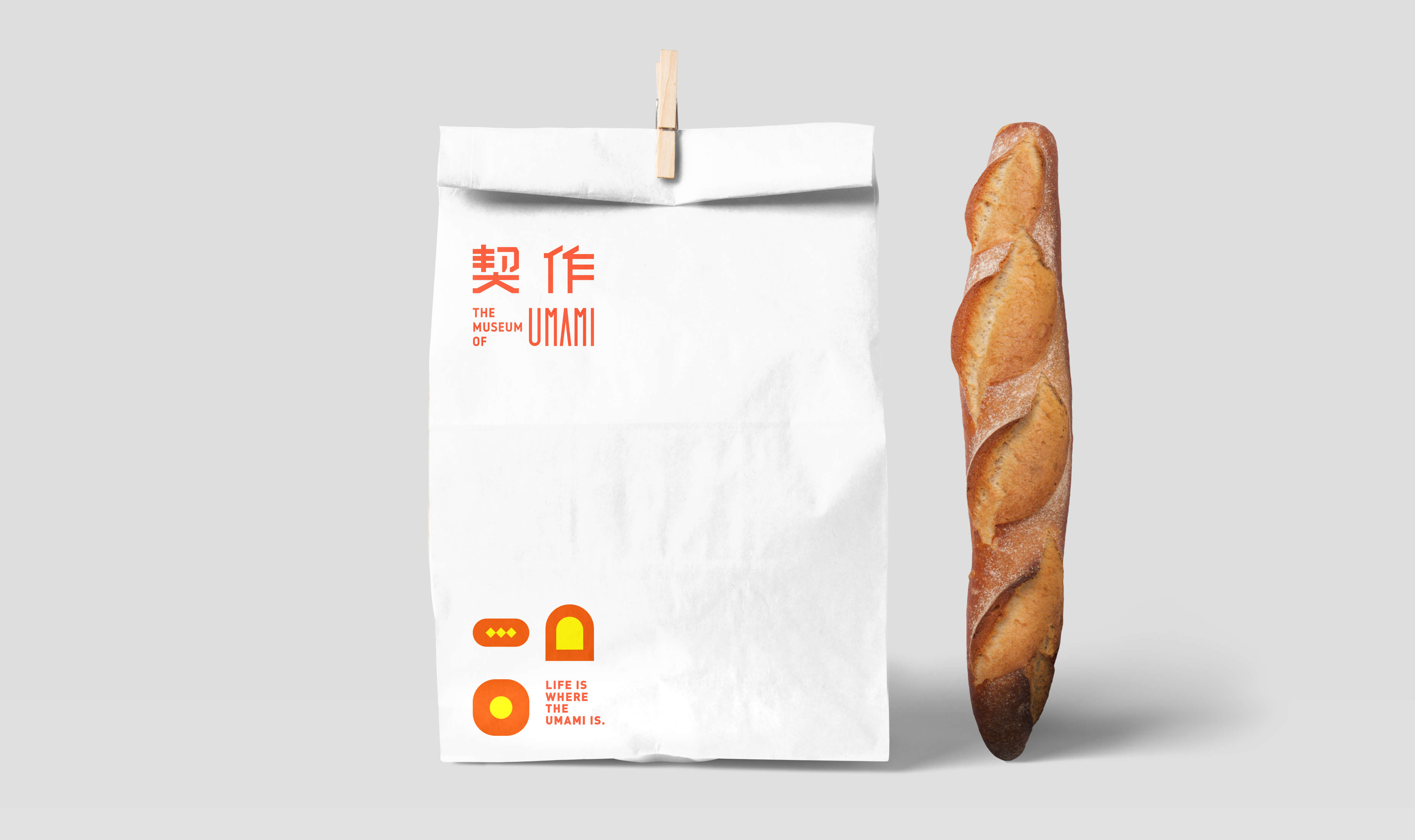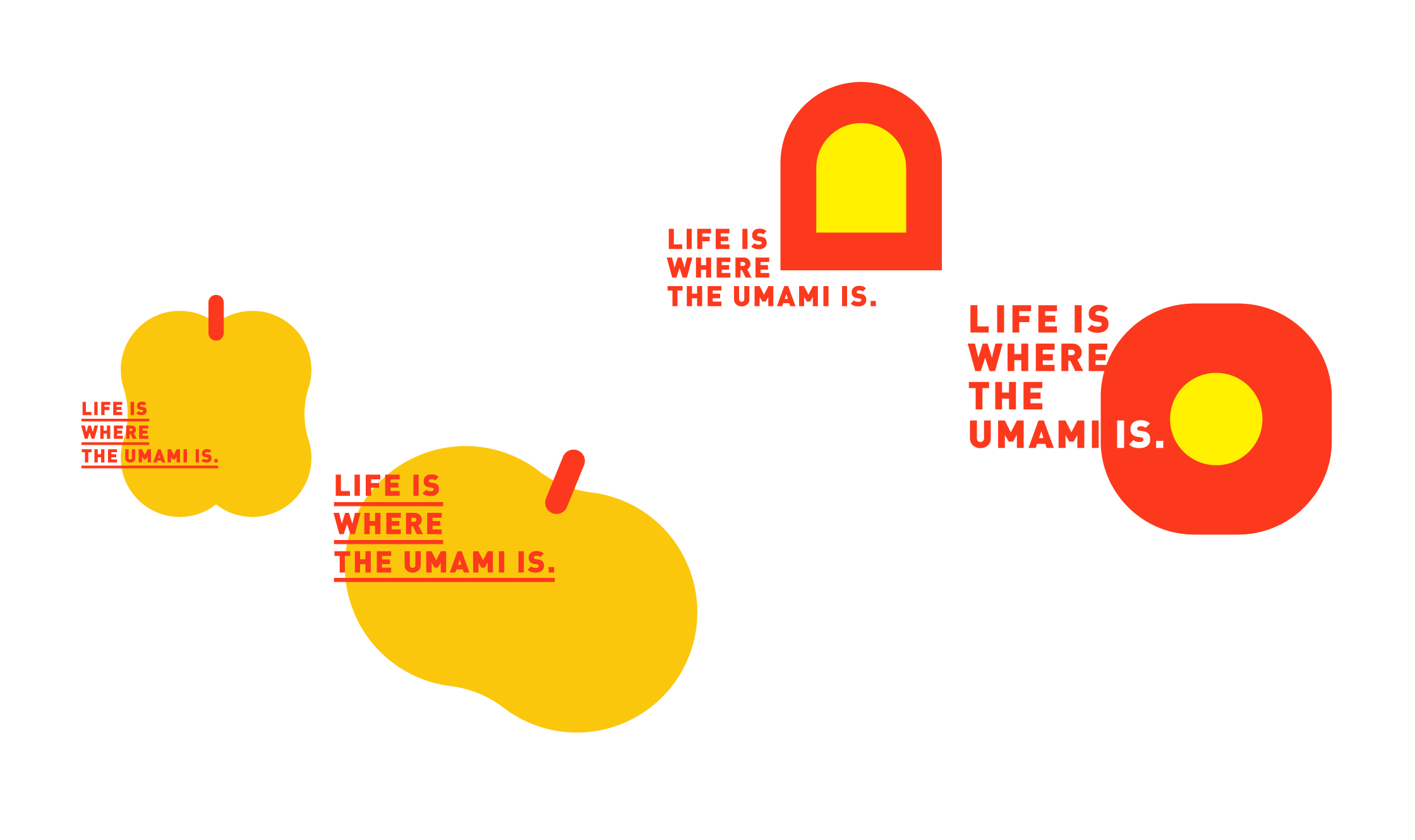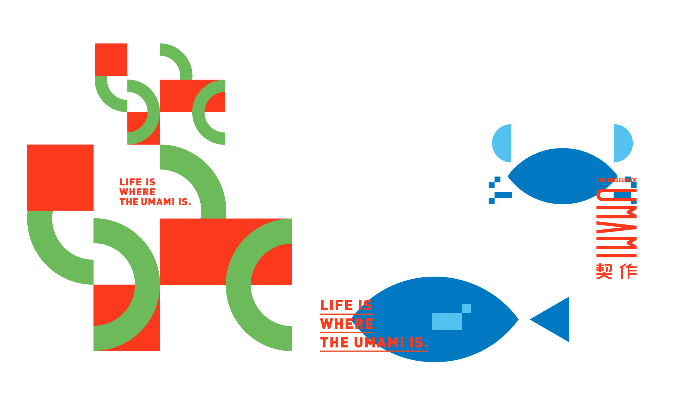 品牌標準字 透過如同現代美術館的識別概念為主軸 強調"鮮味“的顏色計畫 一系列輔助圖形讓消費者快速了解商品服務區塊 一系列海報宣傳系統強調"Life is where the umami is" 生活就在契作的概念 商場內燈箱系統