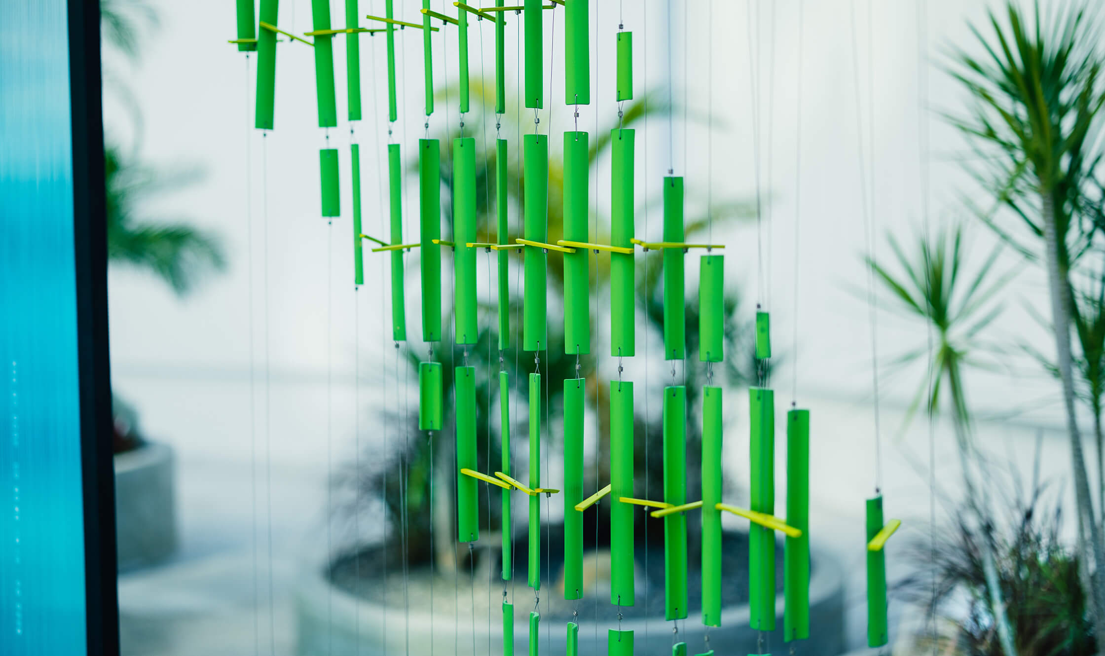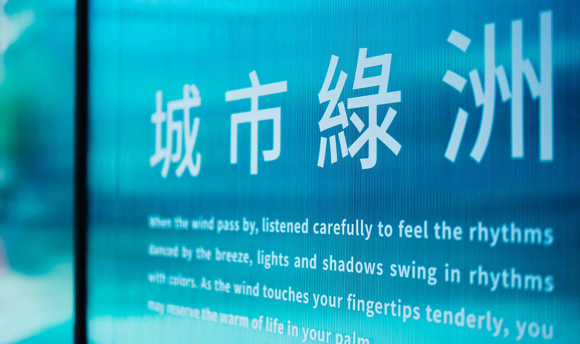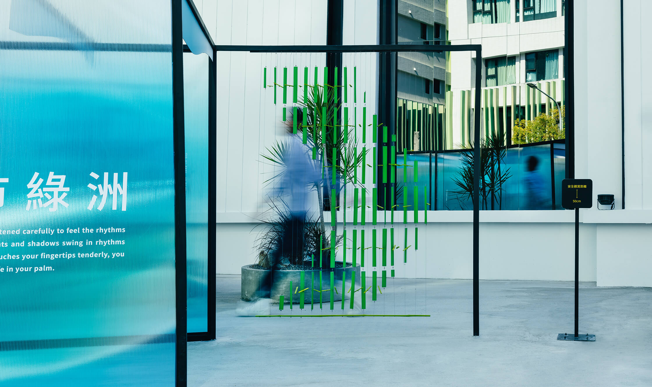 裝置的第一個部份為聽覺區域,意圖捕捉涼風吹過帶來的清脆木聲,感受風的力道及風向。第二區塊為視覺區域,整體帶有冰涼感的藍色隧道,人步行其中也可閱讀兩旁關於風的詩句文字。最後一部分的觸覺區塊,可讓親子同樂,一同翻轉牌上的圖案,想像盛夏時刻的生活元素與點點滴滴。展區中讓人感受有別都市叢林的綠意植物,也一起同步設定位置與形式。讓精巧的展場與周圍帶不同的氛圍。