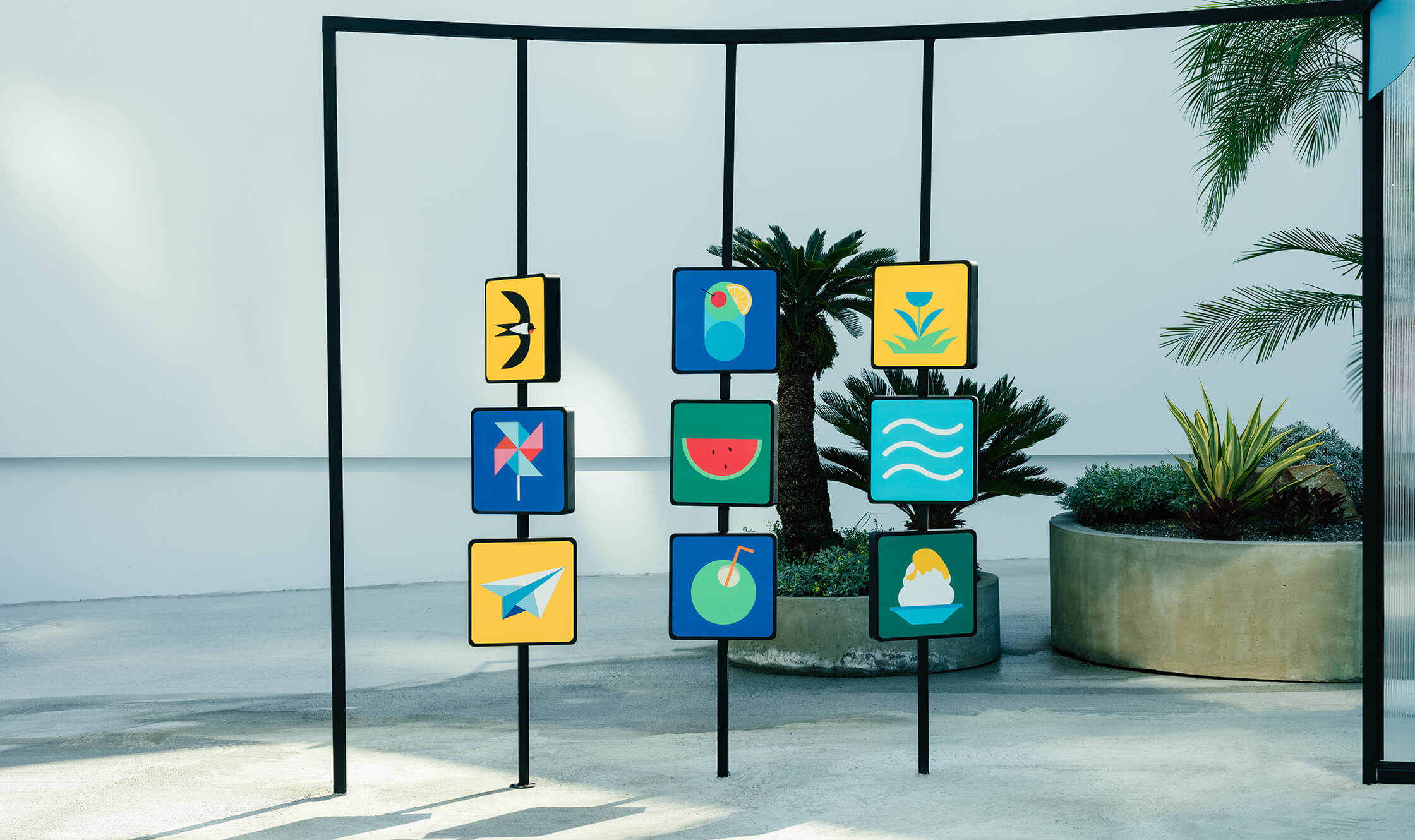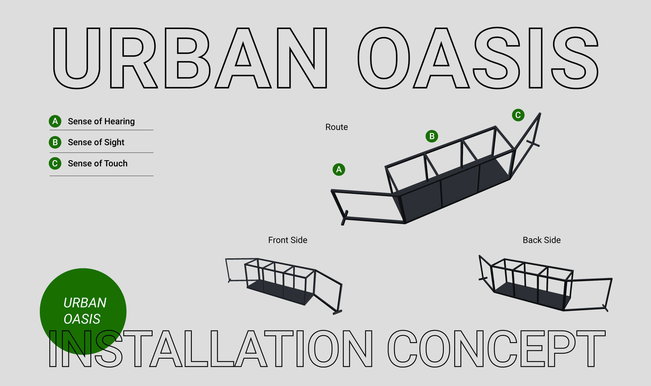 這次良艮團隊受委託在建案接待中心外圍空地規劃出一區主題裝置帶出富有趣味性的概念?我們就從生活中最貼近的天氣延伸構想,在高雄這一個似乎永遠豔陽高照的城市中,什麼能讓人體會那沁入人心般的清涼感受呢? 團隊以都市綠洲主題出發,希望以聽覺/視覺/觸覺三個基本感知打造出一個小巧的裝置。能夠經過的行人,間單跟著路徑,體會綠洲帶給人們的降溫感。