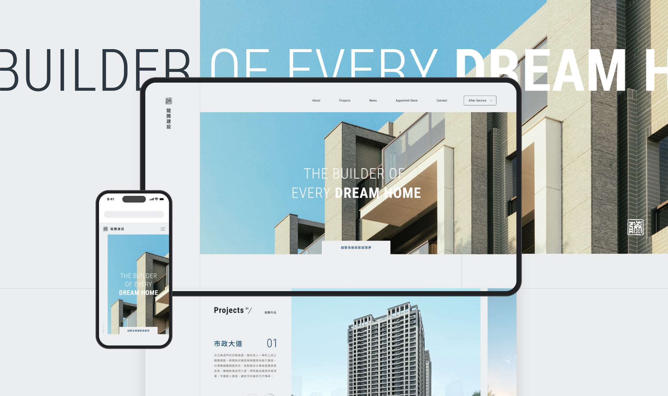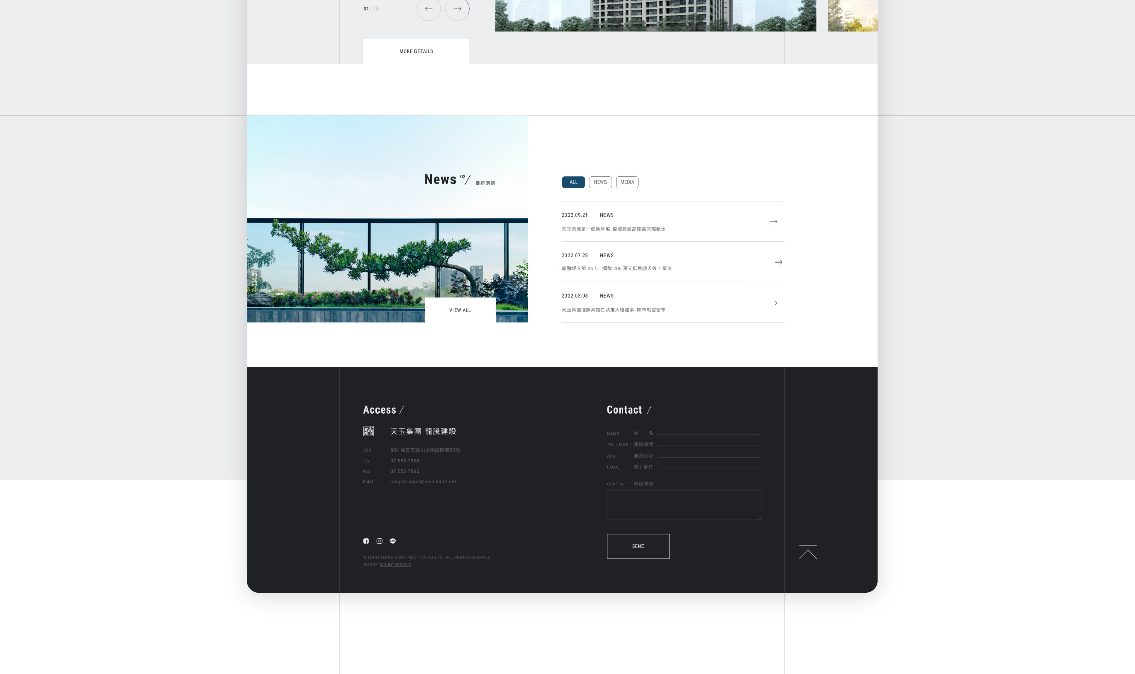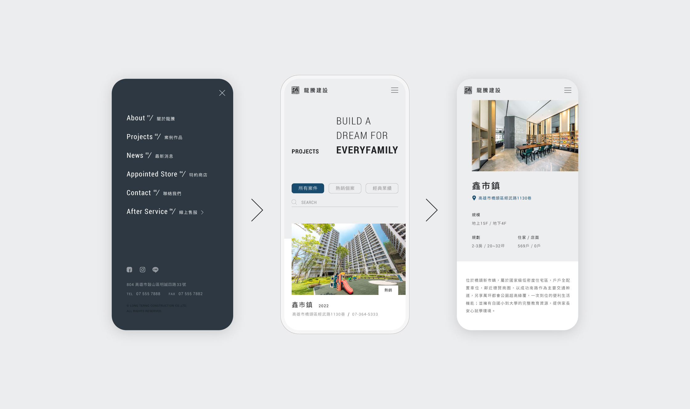 龍騰建設為高雄代表性之建設公司,透過建案規劃定義了城市的面貌。此次設計團隊將舊有網頁不方便更新及閱覽方式更動,重新建立了網站資料結構。也透過圖塊與線條切割的方式,帶出當代建築之氛圍。讓閱讀網站的讀者,像是瀏覽一本精密的建築作品集,呈現出舒緩且簡潔的節奏感。